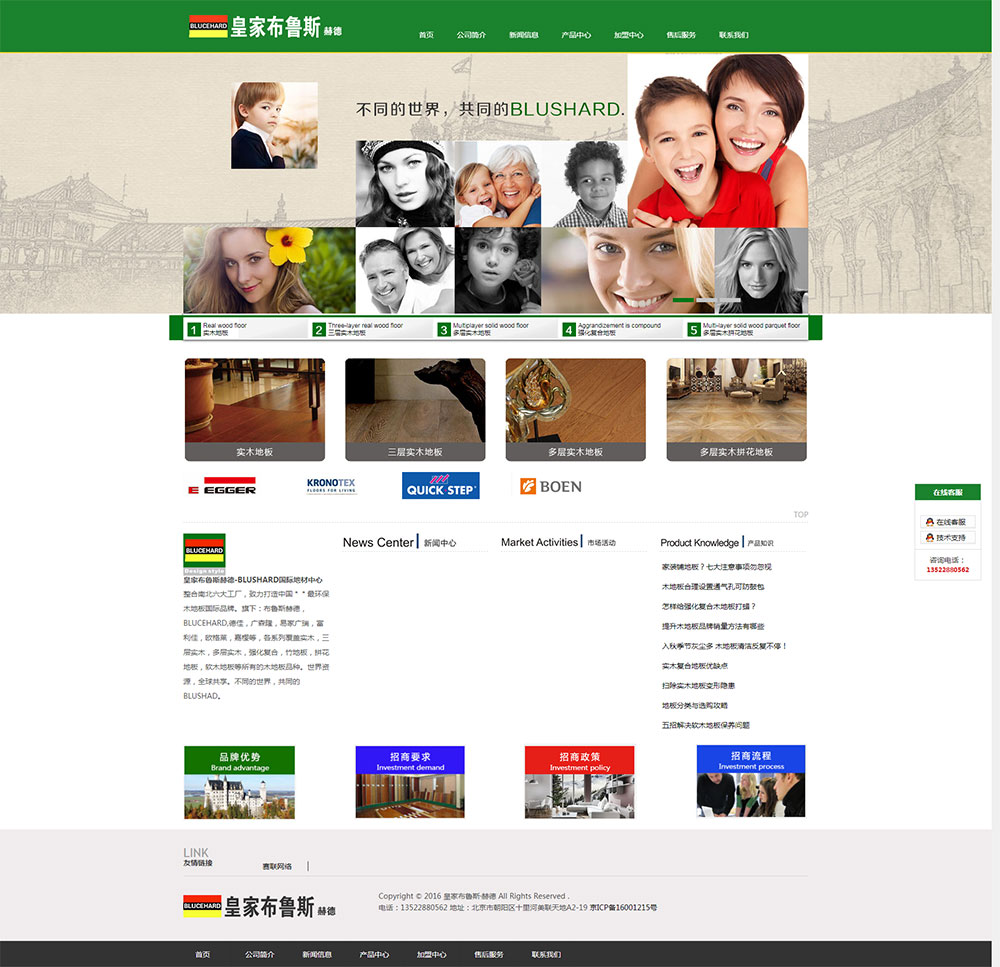 皇家布魯斯赫德-BLUSHARD國際地材中心整合南北六大工廠,致力打造中國**很環(huán)保木地板國際品牌。旗下:布魯斯赫德,BLUCEHARD,德佳,廣森隆,易家廣瑞,富利佳,歐格萊,嘉櫻等,各系列覆蓋實(shí)木,三層實(shí)木,多層實(shí)木,強(qiáng)化復(fù)合,竹地板,拼花地板,軟木地板等所有的木地板品種。世界資源,全球共享。不同的世界,共同的BLUSHAD。