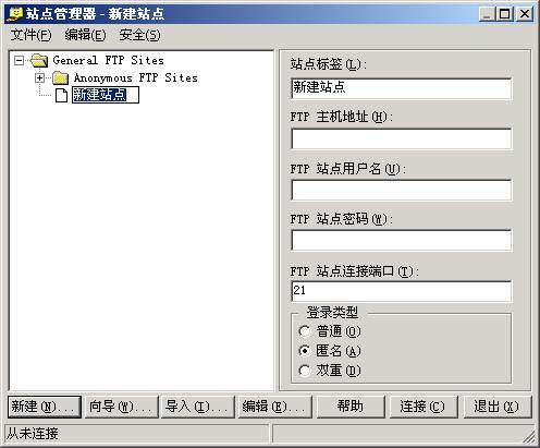 1、打開FTP,彈出“站點(diǎn)管理器”,點(diǎn)擊左下面的"新建",如下圖界面: