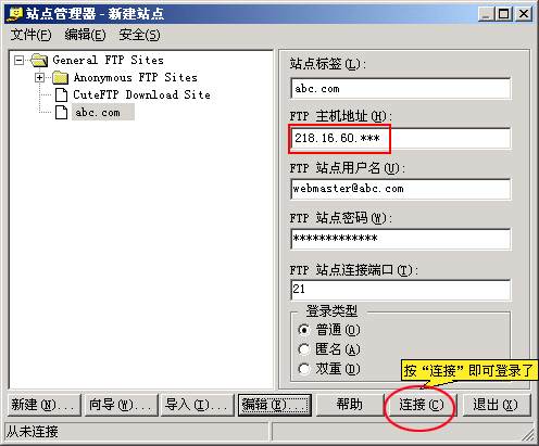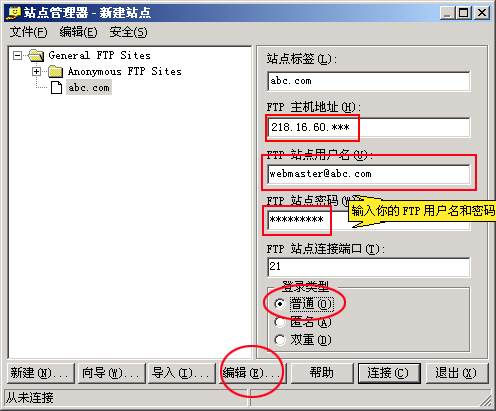 3、然后在右邊對(duì)話框中輸入站點(diǎn)標(biāo)簽(如abc.com),輸入主機(jī)地址,用戶名,密碼和登錄類型要選擇“普通”,輸入完成后,點(diǎn)擊下面菜單欄的“編輯”,界面如下: