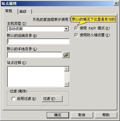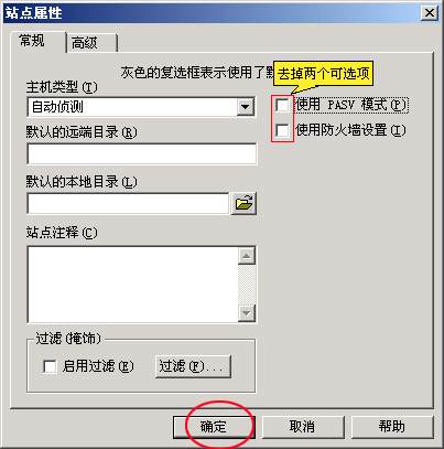 5、在這個(gè)對(duì)話框中,選"常規(guī)"標(biāo)簽,取消"使用 PASV 模式"可選項(xiàng)。接著按“確定”,界面顯示如下: